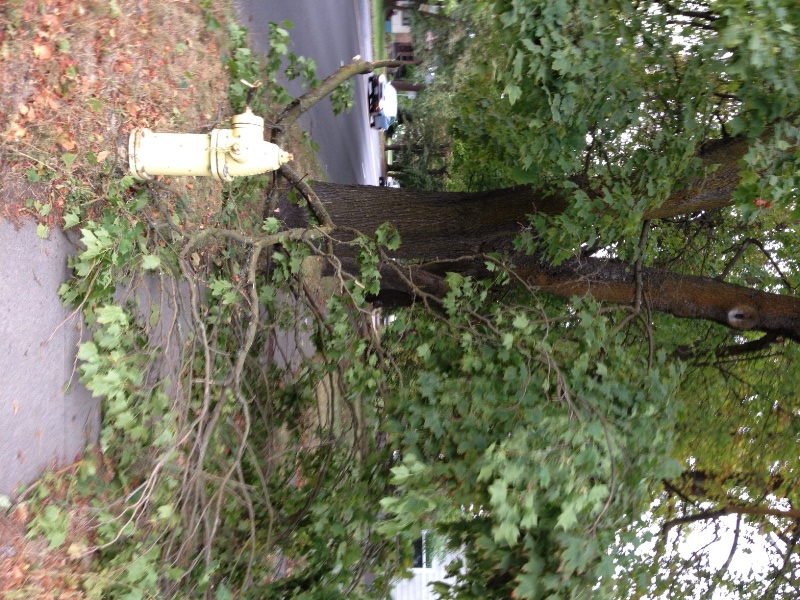 What the photo doesn’t show is that if the tree fell less than eight feet to the left, instead of falling to the right, the tree would have smashed into the house.  Yikes!