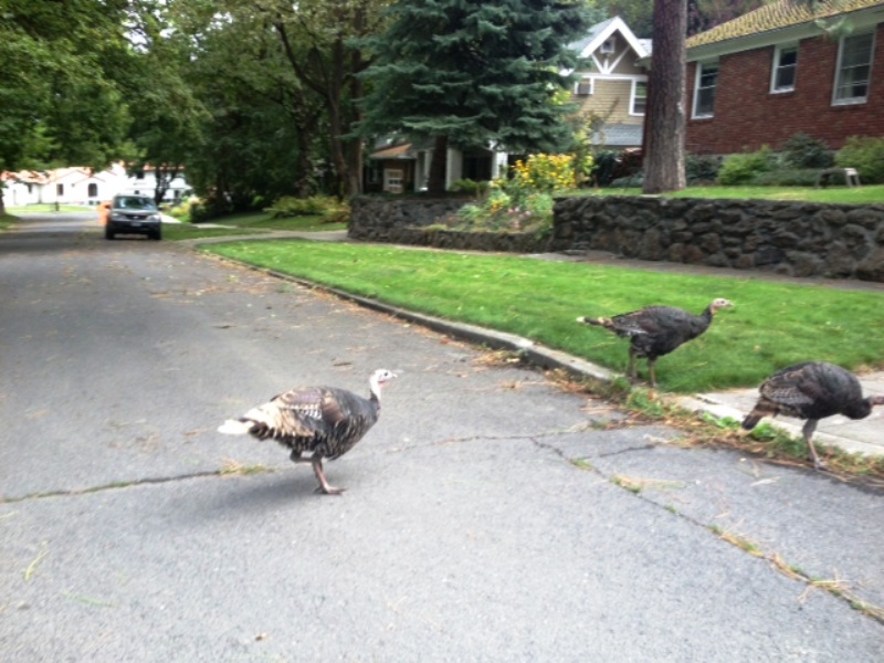My neighbors have chickens, so I thought that because they weren’t afraid of me, perhaps the turkeys were someone’s farm animal.  My neighbor informed me that they are wild turkeys.  Wild animals have been known to invade our neighborhood.  Where do they possibly come from?  Two or three miles southwest of our house is a bluff or ridge.  The animals come up over the ridge and end up in our neighborhood.  I am still confused about the two to three miles that they roamed in the middle.  My neighbor said an adolescent bull moose once found its way to our street!