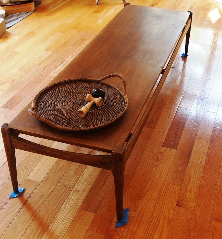 The walnut coffee table measures 71″. I love the mid-century modern style. These photos look pretty good but it needs to be sanded and finished. This was a $100 craigslist score.