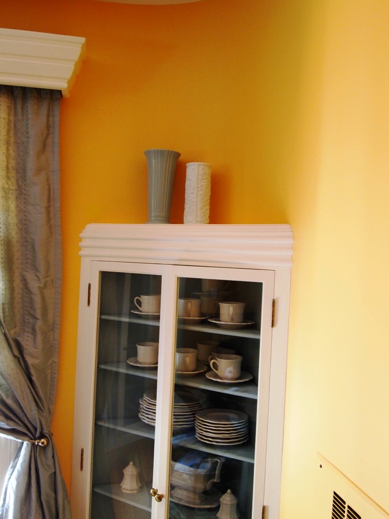 The dining room is painted a shocking caution sign yellow. I can’t stand the color. It offends me every day. I can’t wait until the painter arrives, currently scheduled for the week after Labor Day, while the kids are in school. My china looks fantastic in these built in cabinets that flank the window. The dining room is oval which is super cool. But the color!! Ugh!