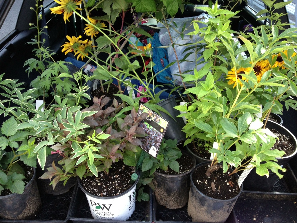 Two women walked up and said, we grabbed the wrong cart. They had my cart! My plants were back! I quickly loaded up my car and brought my treasures home. The boys unloaded the car and my husband and I plotted and planned our plantings for tomorrow. The rain fell at 5 PM just as we were done for the day. The photo of my plants may not look like much but they have huge growth potential, the bushes will grow up to 8 feet tall, and the elderberry can be 13 feet tall.